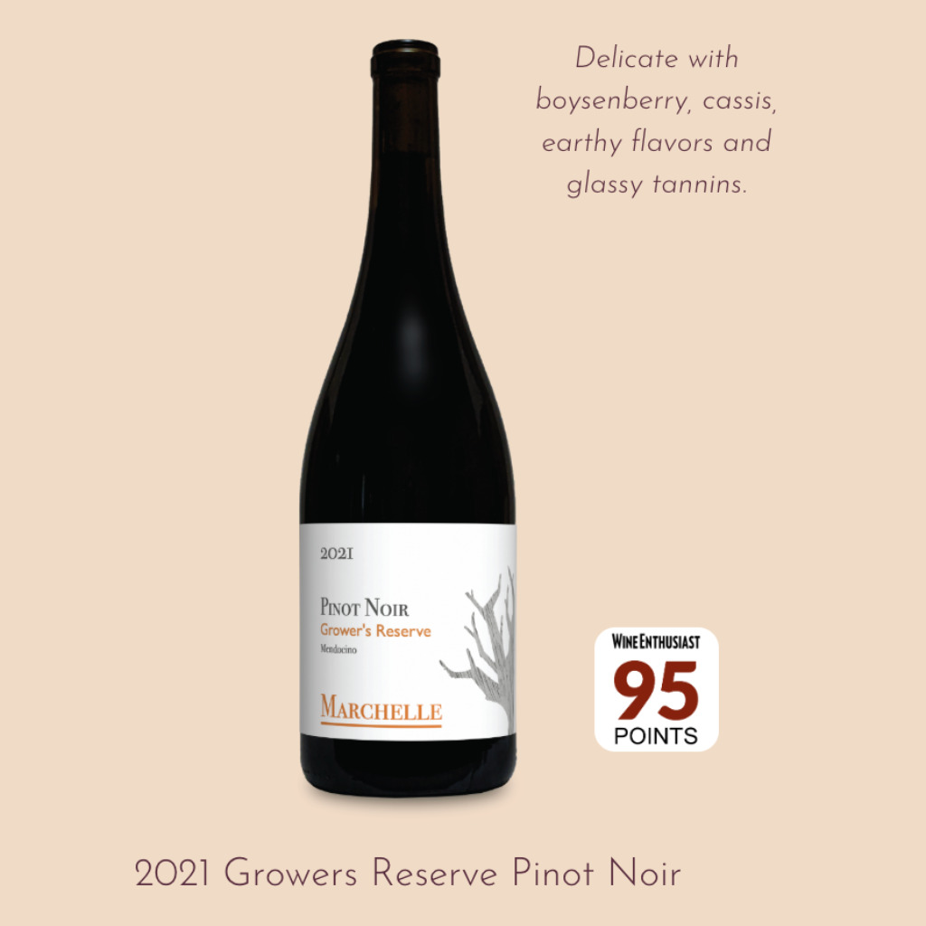 Pinot Noir is the heartbeat of Marchelle. With over four decades of experience, Greg La Follette brings a Burgundian reverence and California daring to every vintage. The 2021 Grower’s Reserve Pinot Noir showcases the Manchester Ridge Vineyard, its lifted bouquet supported by the strength of the Oppenlander Vineyard. Available through 305 Wines!
