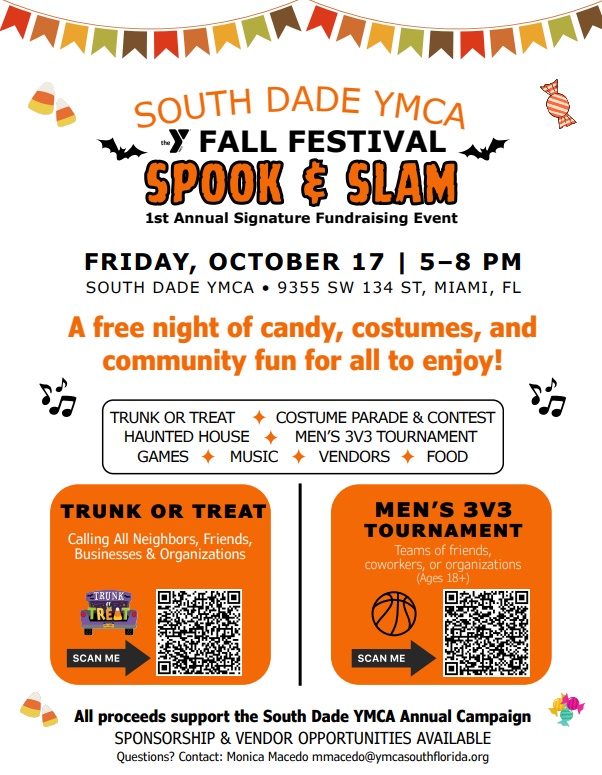 🎃 Get ready for a spook-tacular night at South Dade YMCA’s Fall Festival: Spook & Slam! This FREE, family-friendly event is open to the public and packed with Halloween fun for all ages.