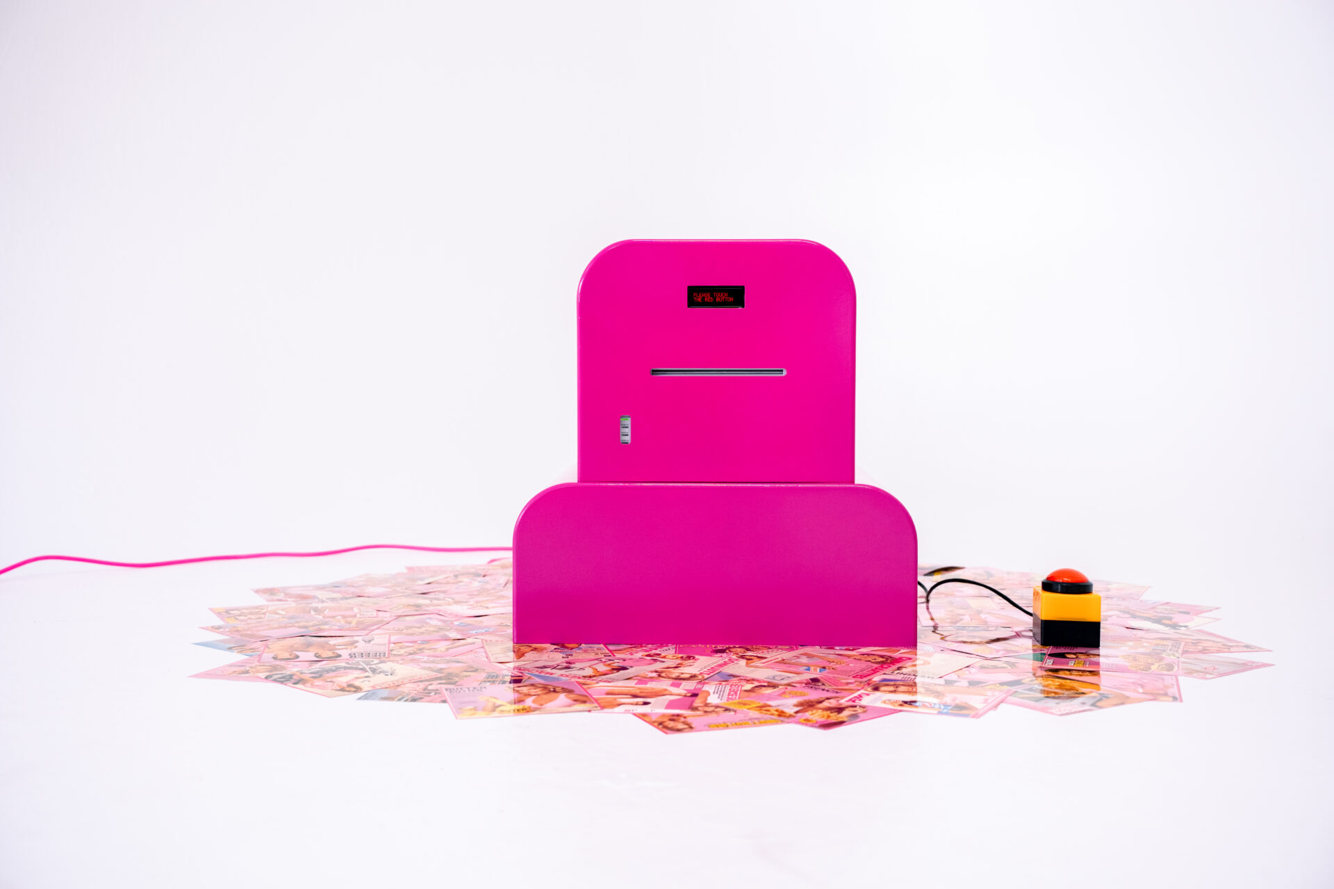 At the center of ClownVamp’s installation is a bright pink robot that generates endless, AI-produced “junk mail” at the push of a button. Using a local AI model on an embedded NVIDIA Jetson computer, it prints surreal, gluttony-inspired images on 6×6 inch paper with no Wi-Fi or cloud, producing a continuous flood of algorithmic output.