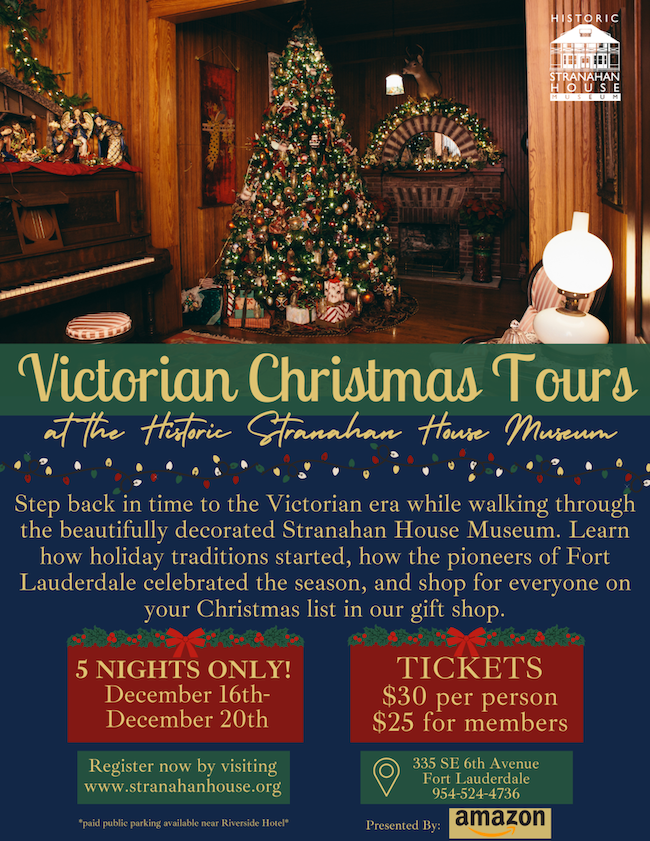 Deck the Halls with History. The Historic Stranahan House Museum is hosting Victorian Christmas Tours, presented by Amazon, Dec. 16 through Dec. 20, from 5 to 8 p.m. each evening. The community is invited to step back in time to the Victorian era while walking through the beautifully decorated Stranahan House Museum. Attendees will learn how holiday traditions started, how the pioneers of Fort Lauderdale celebrated the season, and shop for everyone on their Christmas list in the gift shop. Tours are $30 per person or $25 for members.