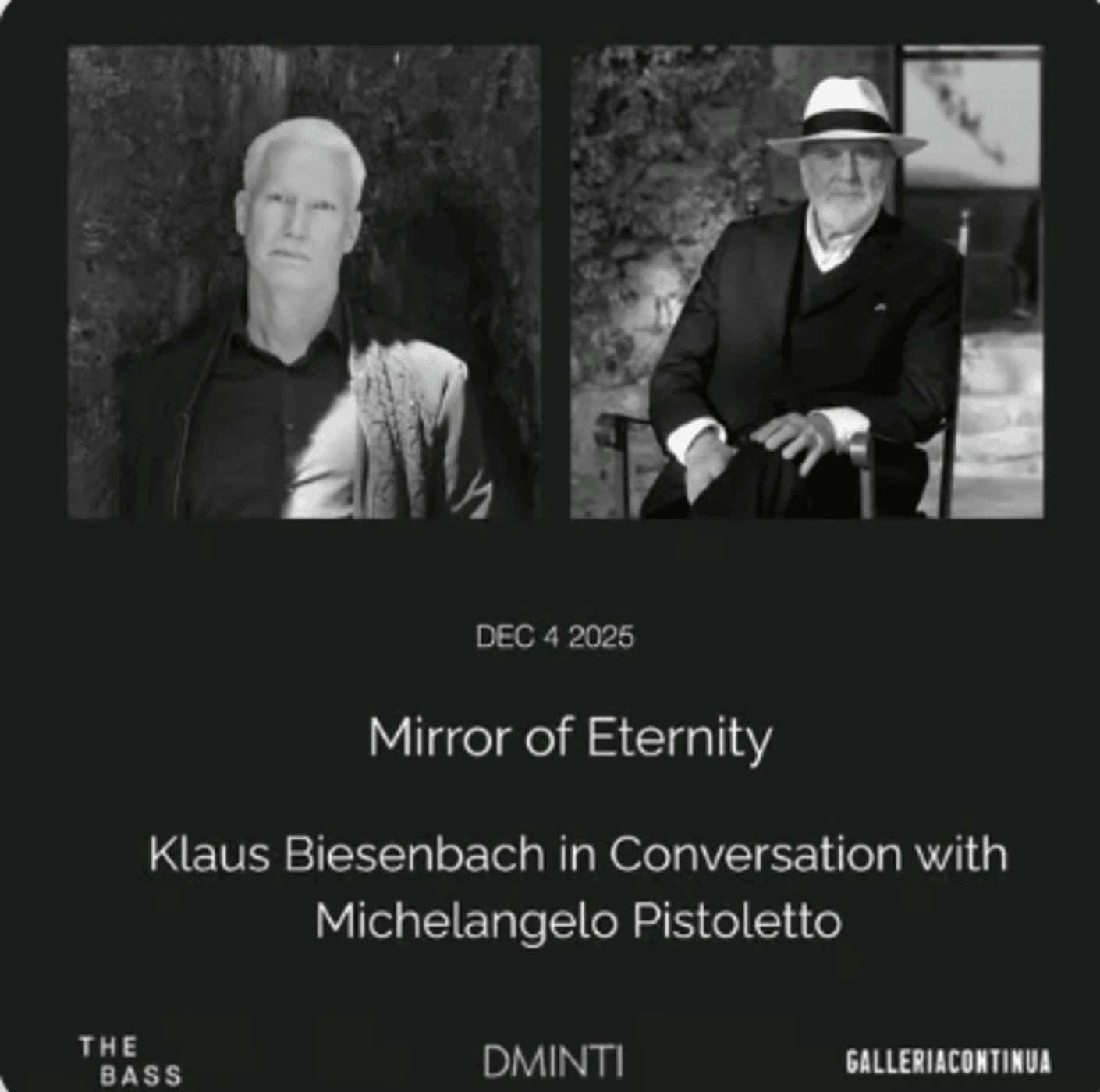 December 4 @ 10:30 am - 12:30 pm Mirror of Eternity- Klaus Biesenbach in Conversation with Michaelangelo Pistoletto The Bass Museum of Art 2100 Collins Ave, Miami, T, United States ... Read more Free