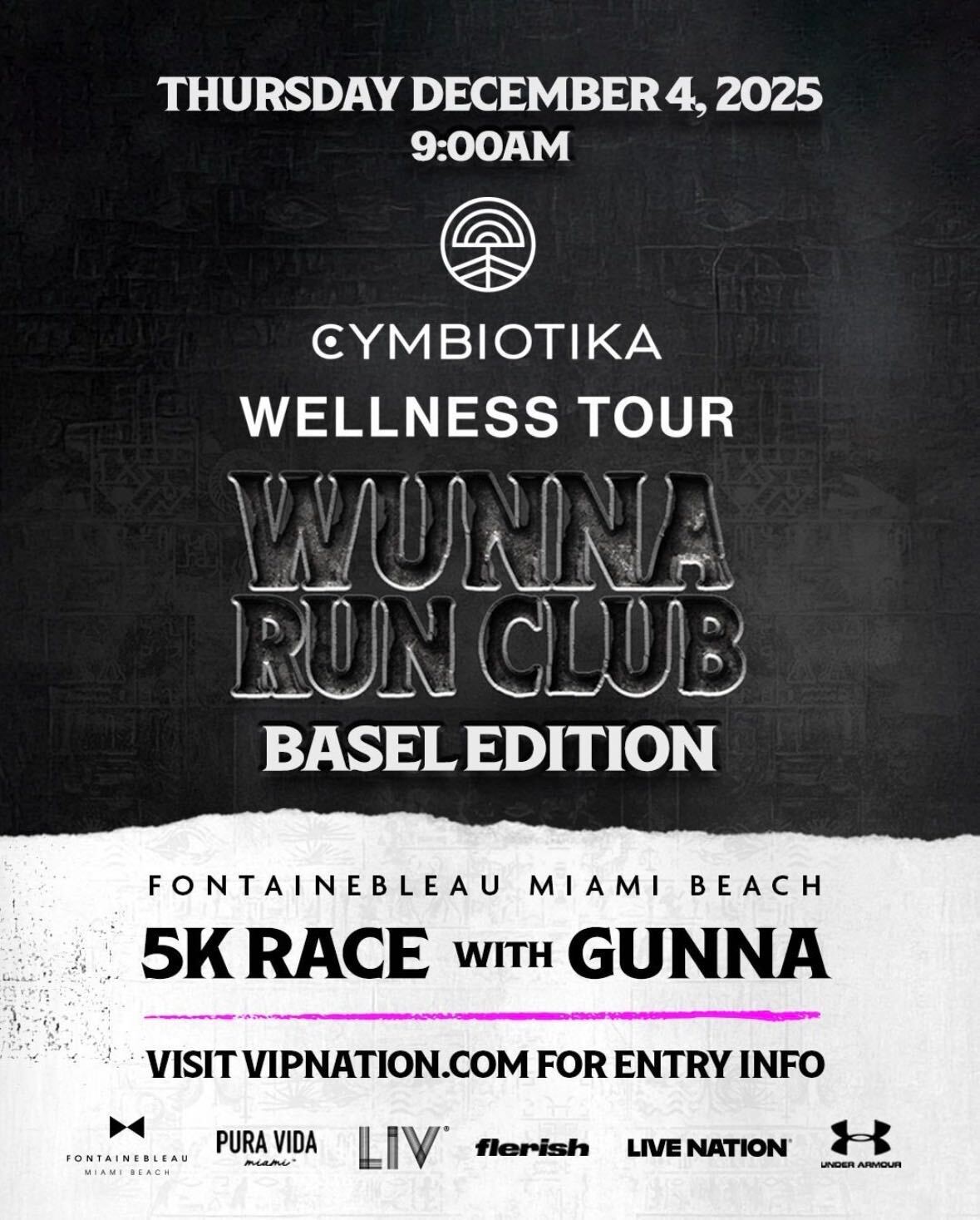 December 4 @ 9:00 am - 5:00 pm Gunna’s Wunna Run Club Teams Up with Cymbiotika for a 5K Race and Art Basel Takeover at Fontainebleau Miami Beach Fontainebleau Miami Beach 4441 Collins Av., Miami Beach ... Read more $75