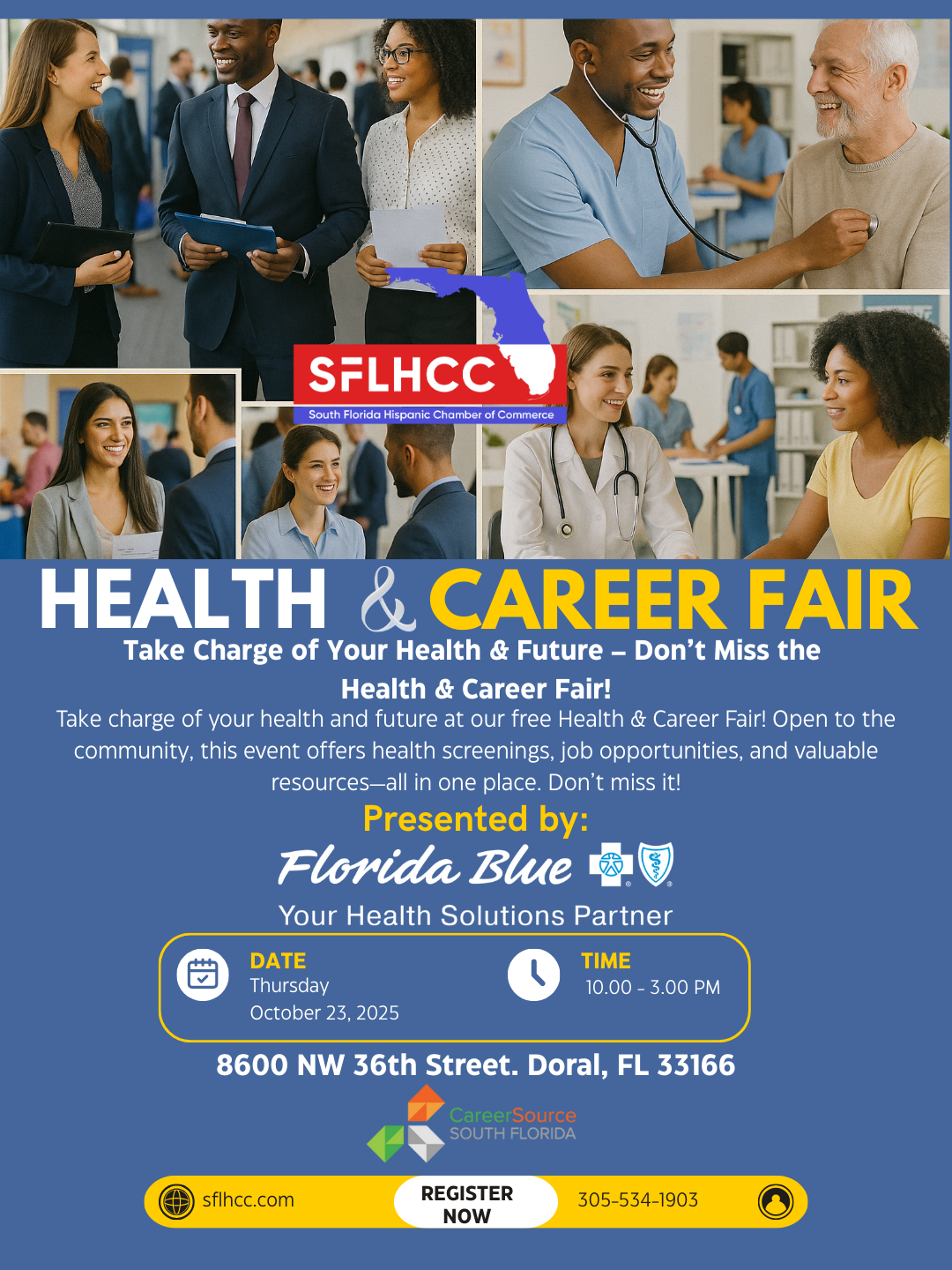 October 23 @ 10:00 am - 3:00 pm SFLHCC Career and Health Fair Florida Blue 8600 NW 36th Street, Doral ... Read more FREE TO PUBLIC